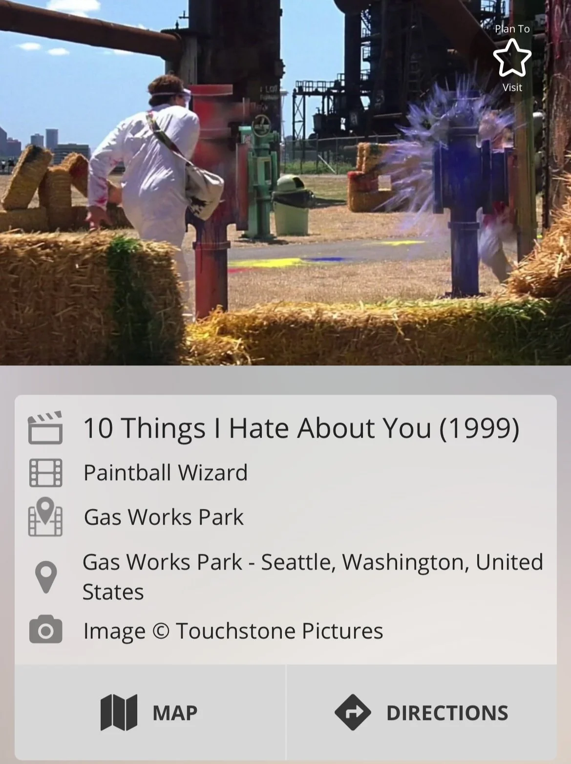 Scene: The unforgettable paintball scene was filmed at Gas Works Park, a unique location with a panoramic view of Seattle's skyline and nearby Lake Union.