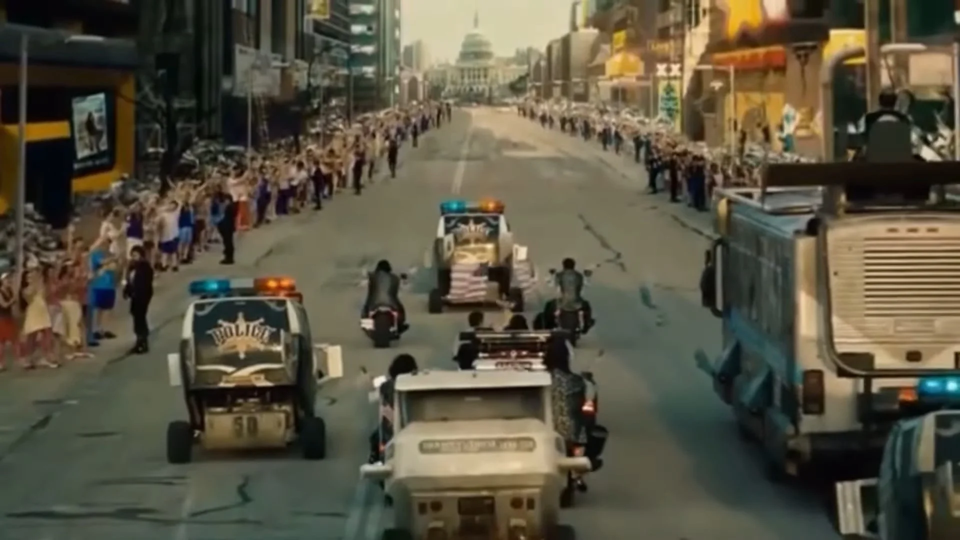 1: President Camacho drives down the main approach to the "U.S. Capitol" in the distance with Joe.