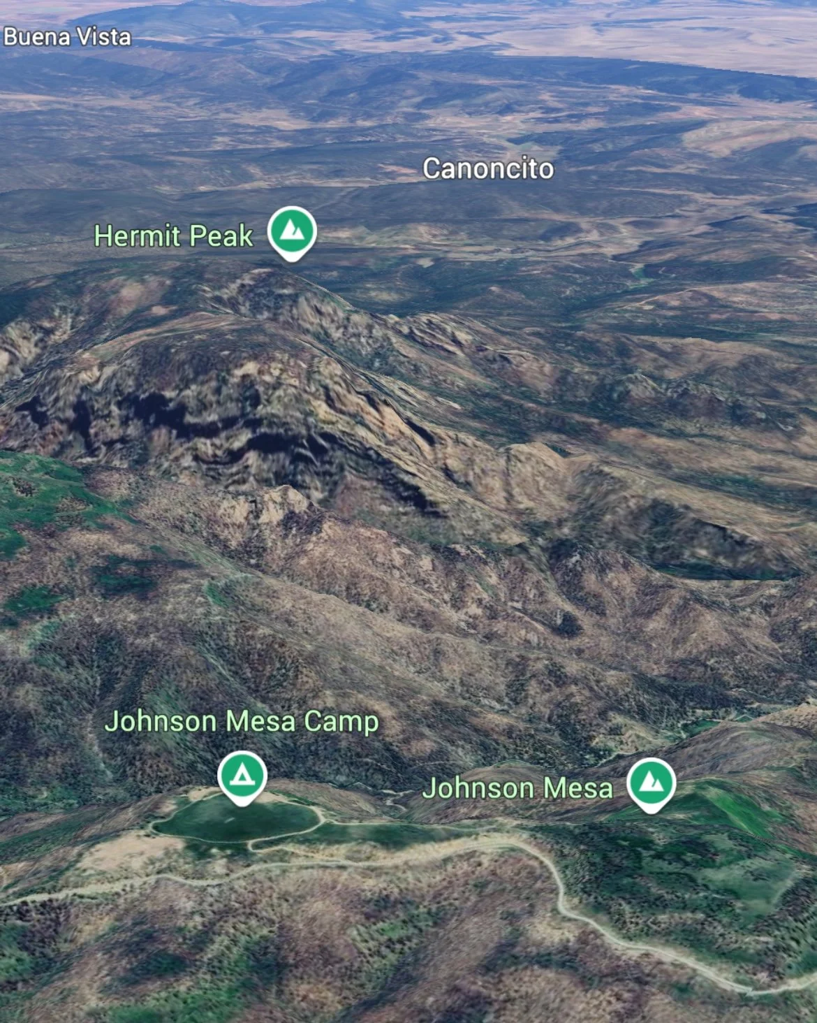Checking satellite imagery and maps, I found a road leading up to the northeast side of Johnson Mesa Camp - exactly where the scene was shot, with Hermit Peak visible in the background.